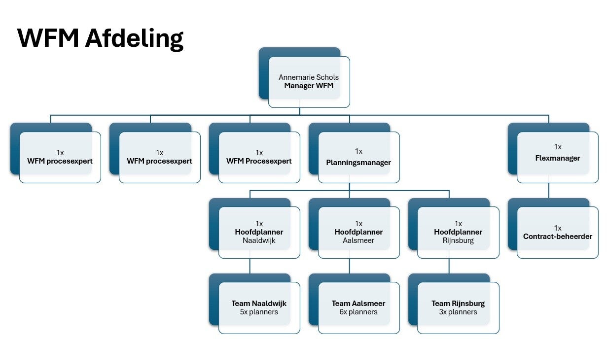 Annemarie was verantwoordelijk voor de PSQDC (people, safety, quality, delivery & costs) van de afdeling WFM. De afdeling was groeiende, bleef binnen begroting en verzuimdoelstellingen, en stond voor een grote transitie richting Centraal Plannen: de organisatie wenste een centrale rol bij het maken van personeelsplanning door de afdeling WFM, maar deze afdeling bestond tot voor kort nog niet. Stakeholdermanagement en stevige rapportage aan hoger management was cruciaal in deze rol. De transitie duurde langer dan gehoopt, maar ging gestaag door, mede door het doorzettingsvermogen en enthousiasme van Annemarie. Haar team gaat voor dezelfde doelen door het vuur, mede omdat de doelen ook van henzelf zijn.